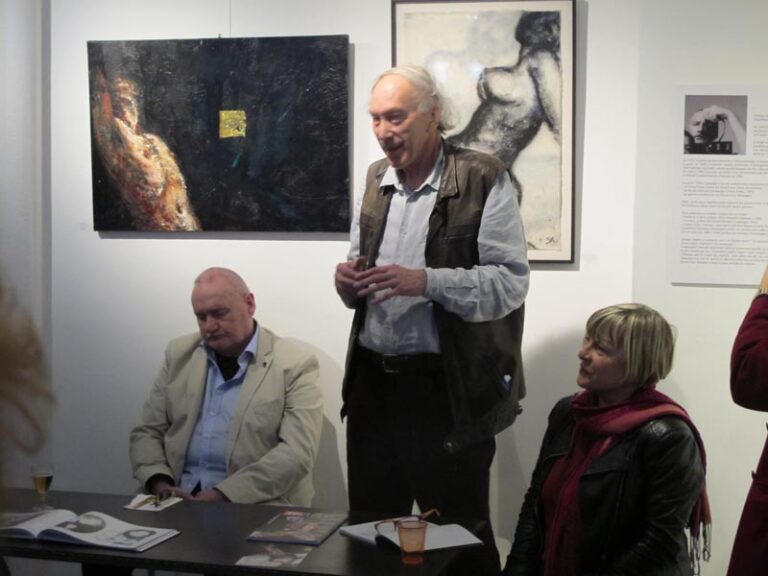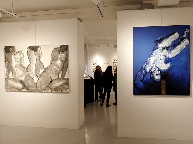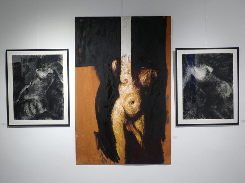 Hashpa de son côté a poursuivi sa route et petit à petit s’est fait très discret, presque oublié ; lui qui avait été le fer de lance d’un expressionnisme sombre et puissant, qui avait su marquer les esprits et transmis technique et savoir-faire à de nombreux nouveaux talent. Elle lui rend visite, le découvre isolé par la maladie et comme détaché de la passion qui pourtant le dévorait. Elle décide alors – à sa façon – de rendre hommage au peintre en le plaçant de nouveau sous les spots et sur les cimaises, ainsi qu’à l’homme en proposant ce duo d’artistes, d’égale à égal, de nu à nu, de corps à corps…